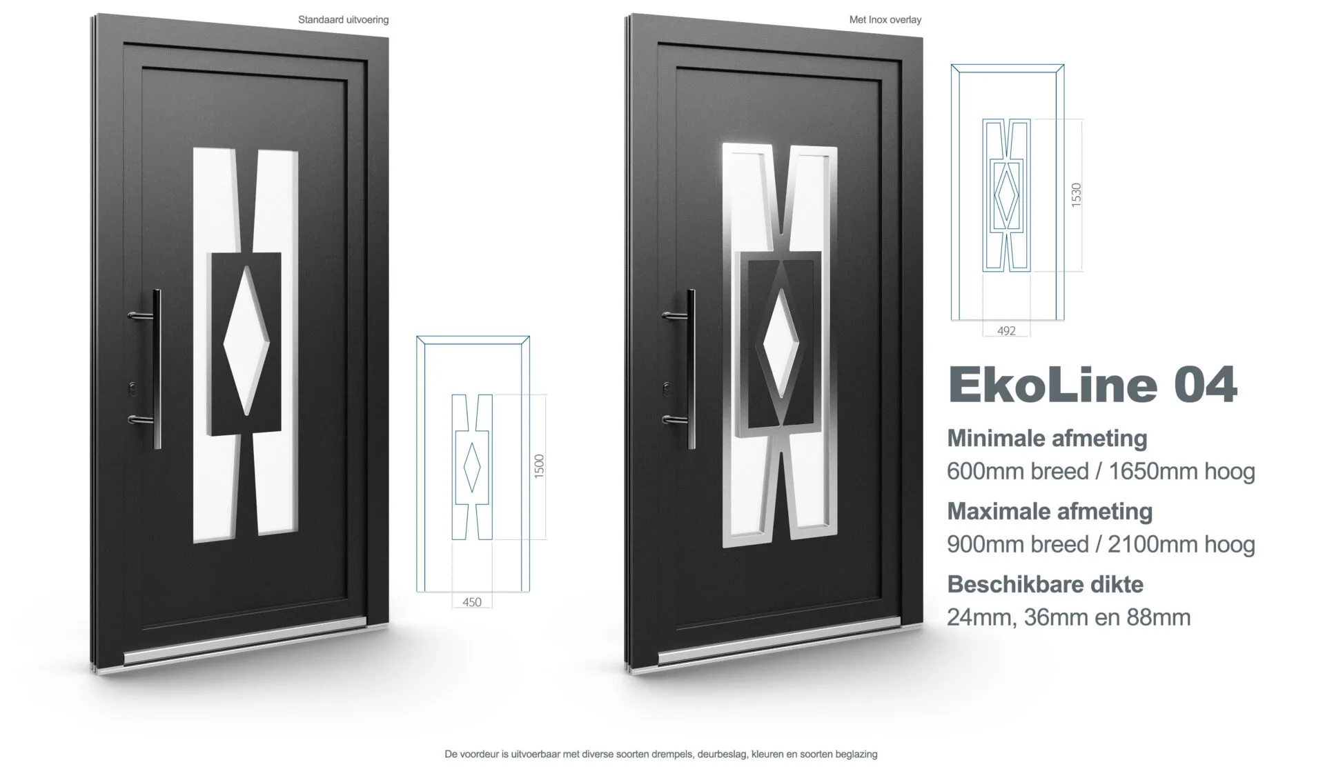 Aluplast kunststof voordeur model EkoLine 04. Verkrijgbaar in wit (RAL 9016) of crème (RAL 9001), optioneel met diverse folies en Inox accenten.