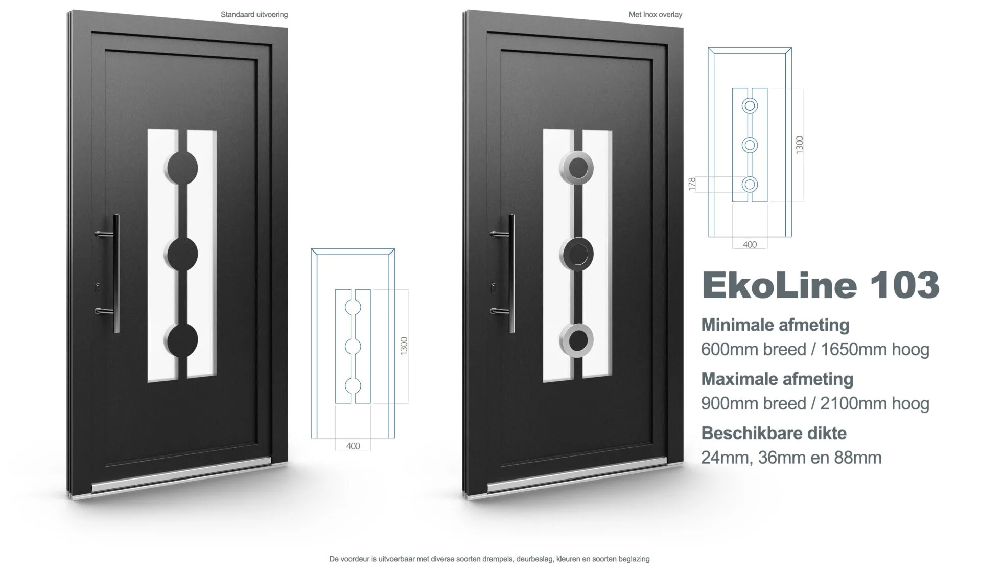 Aluplast kunststof voordeur model EkoLine 103. Verkrijgbaar in wit (RAL 9016) of crème (RAL 9001), optioneel met diverse folies en Inox accenten.