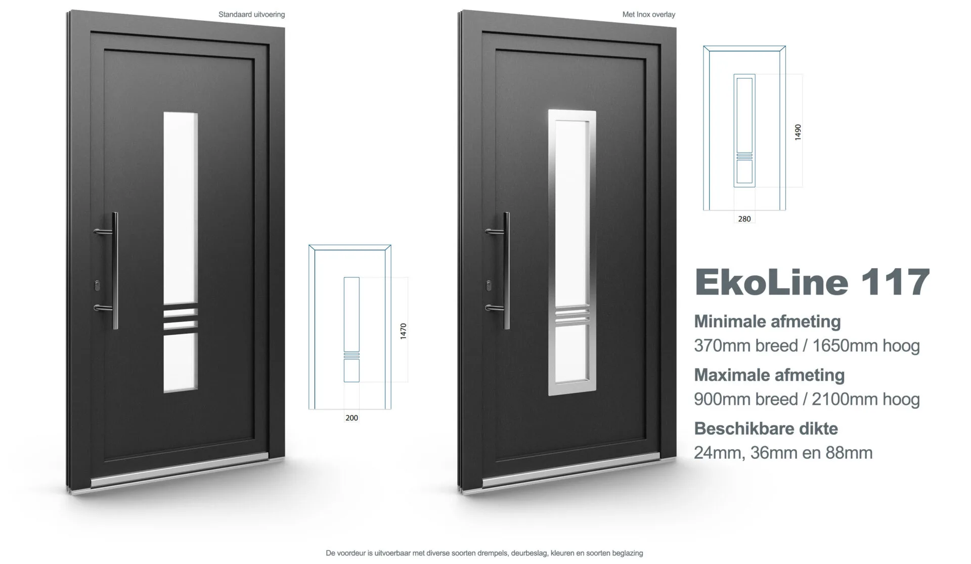 Aluplast kunststof voordeur model EkoLine 117. Verkrijgbaar in wit (RAL 9016) of crème (RAL 9001), optioneel met diverse folies en Inox accenten.