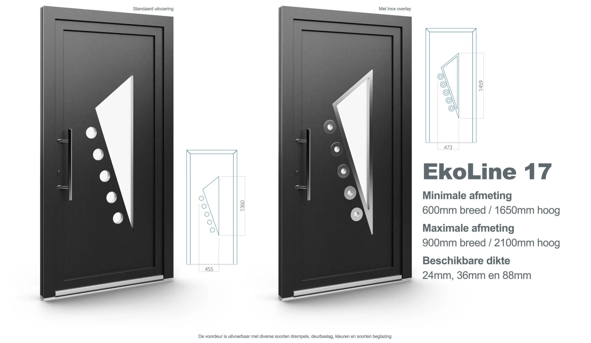 Aluplast kunststof voordeur model EkoLine 17. Verkrijgbaar in wit (RAL 9016) of crème (RAL 9001), optioneel met diverse folies en Inox accenten.