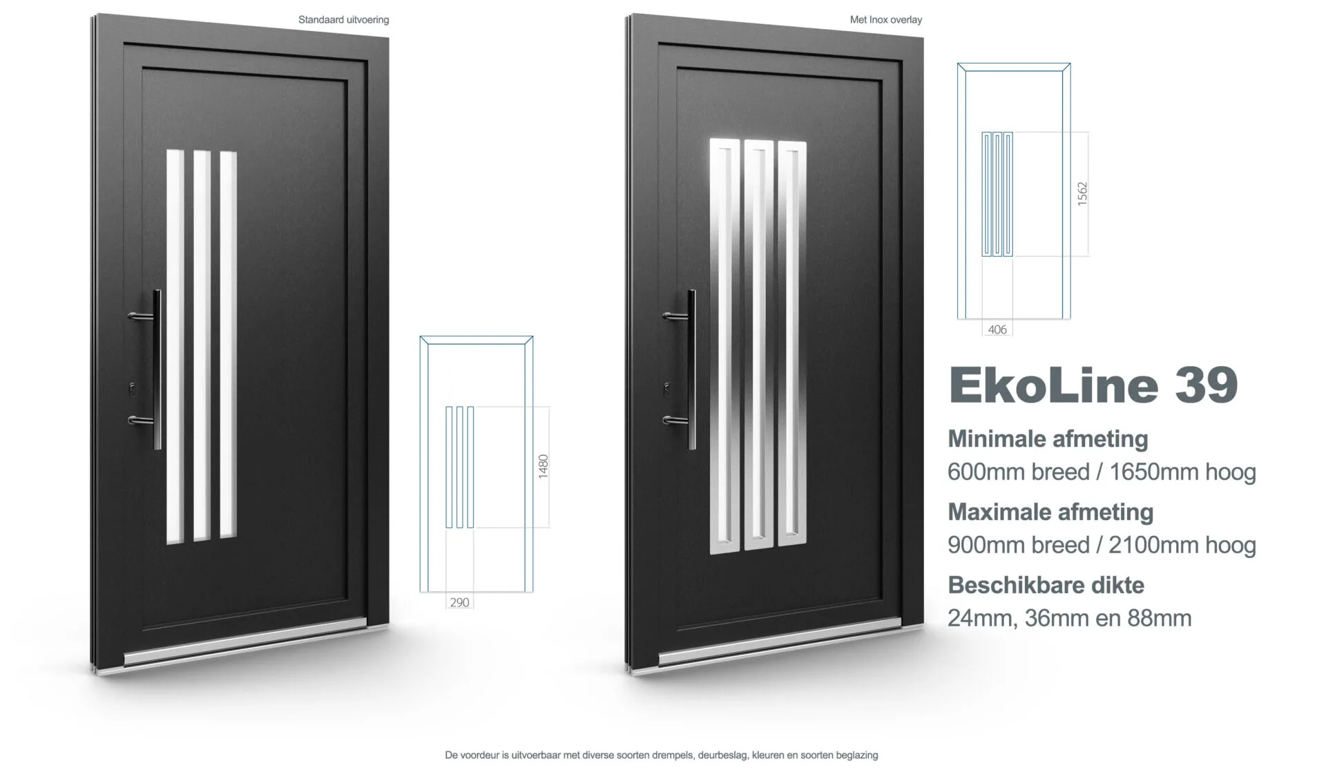 Aluplast kunststof voordeur model EkoLine 39. Verkrijgbaar in wit (RAL 9016) of crème (RAL 9001), optioneel met diverse folies en Inox accenten.