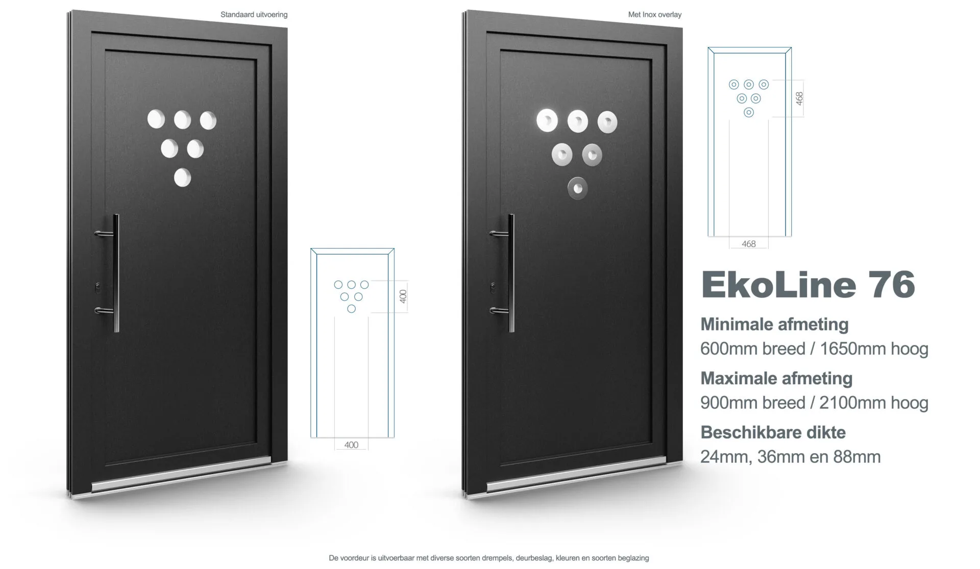 Aluplast kunststof voordeur model EkoLine 76. Verkrijgbaar in wit (RAL 9016) of crème (RAL 9001), optioneel met diverse folies en Inox accenten.